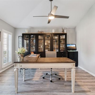 Ceiling Fan(s), Eating Space In Kitchen, High Ceilings, Open Floorplan, Primary Bedroom Main Floor, Solid Surface Counters, Solid Wood Cabinets, Split Bedroom, Stone Counters, Thermostat, Vaulted Ceiling(s), Walk-In Closet(s)