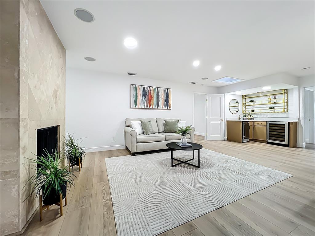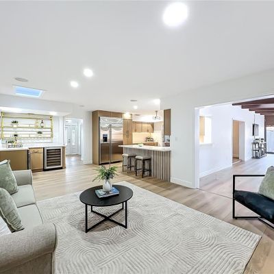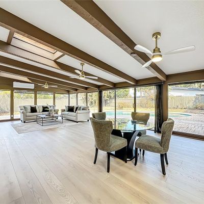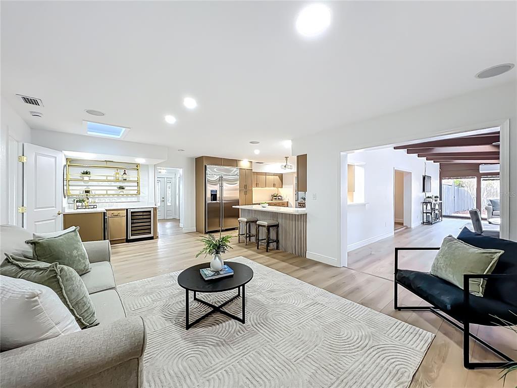 Ceiling Fan(s), Eating Space In Kitchen, Kitchen/Family Room Combo, Open Floorplan, Primary Bedroom Main Floor, Skylight(s), Solid Surface Counters, Solid Wood Cabinets, Split Bedroom, Walk-In Closet(s), Wet Bar