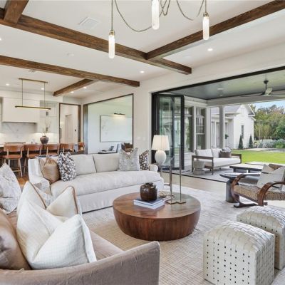 Built-in Features, Ceiling Fan(s), Coffered Ceiling(s), Crown Molding, Eating Space In Kitchen, Kitchen/Family Room Combo, Living Room/Dining Room Combo, Open Floorplan, Primary Bedroom Main Floor, Solid Wood Cabinets, Stone Counters, Thermostat, Vaulted Ceiling(s), Walk-In Closet(s), Wet Bar, Window Treatments