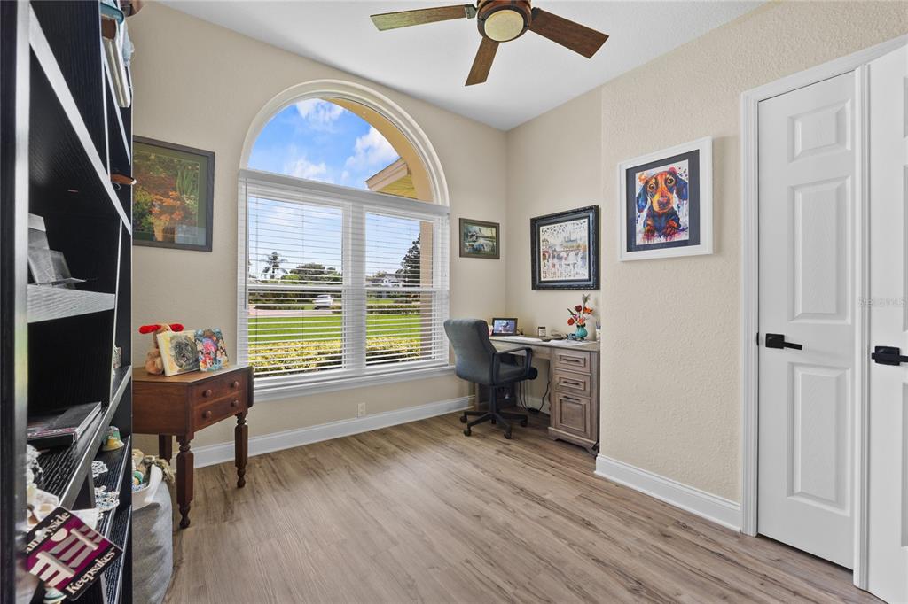 Ceiling Fan(s), Crown Molding, Eating Space In Kitchen, High Ceilings, Open Floorplan, Primary Bedroom Main Floor, Solid Surface Counters, Split Bedroom, Stone Counters, Tray Ceiling(s), Walk-In Closet(s), Window Treatments