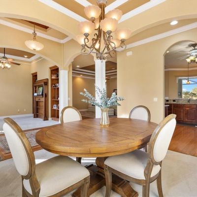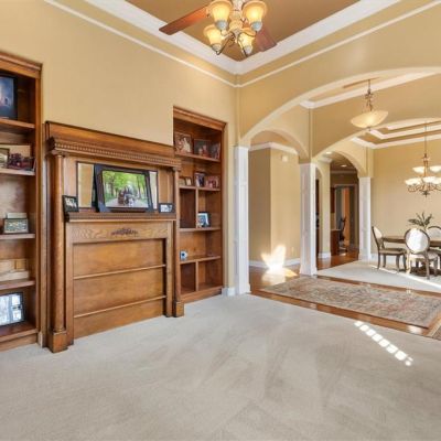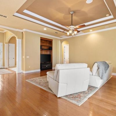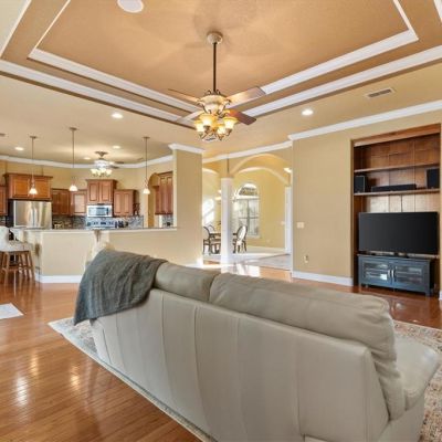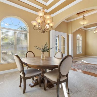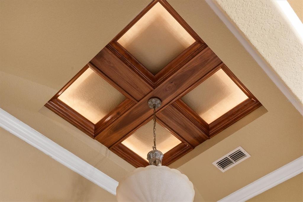 Built-in Features, Ceiling Fan(s), Coffered Ceiling(s), Crown Molding, Eating Space In Kitchen, High Ceilings, Open Floorplan, Solid Wood Cabinets, Split Bedroom, Stone Counters, Thermostat, Tray Ceiling(s), Walk-In Closet(s), Window Treatments