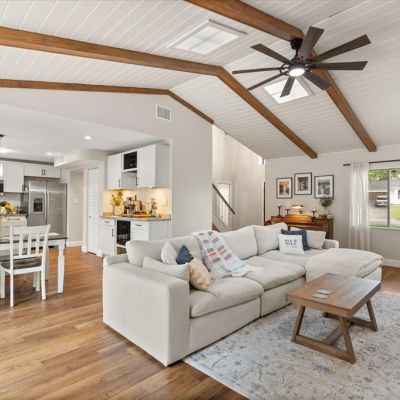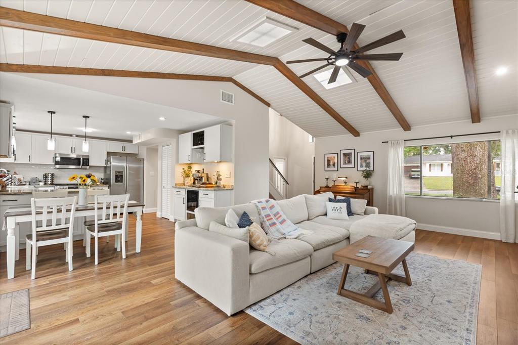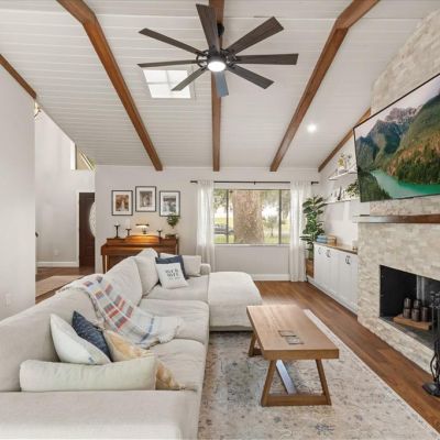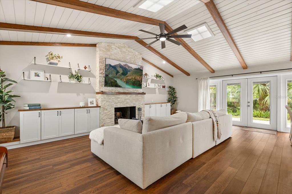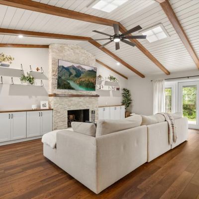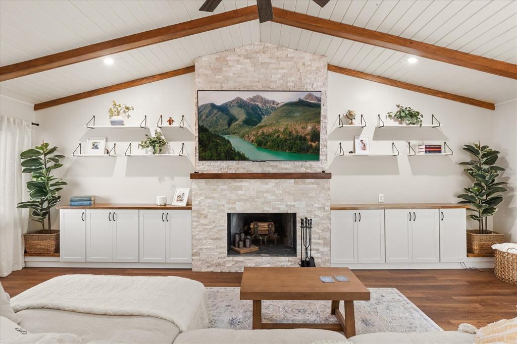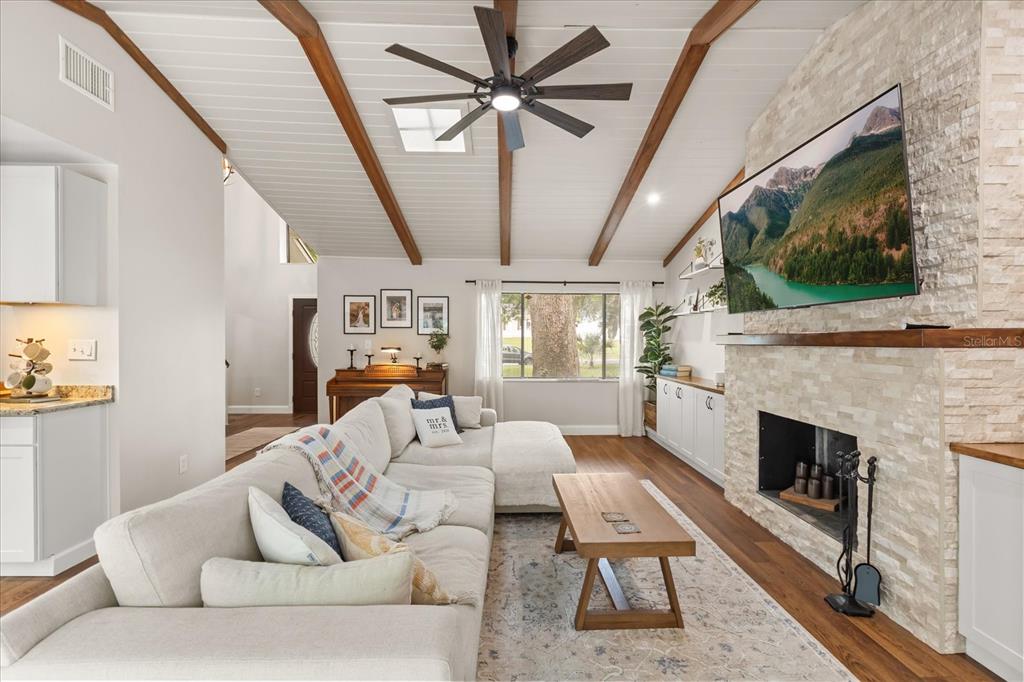 Cathedral Ceiling(s), Ceiling Fan(s), High Ceilings, Kitchen/Family Room Combo, Living Room/Dining Room Combo, Open Floorplan, Primary Bedroom Main Floor, Stone Counters