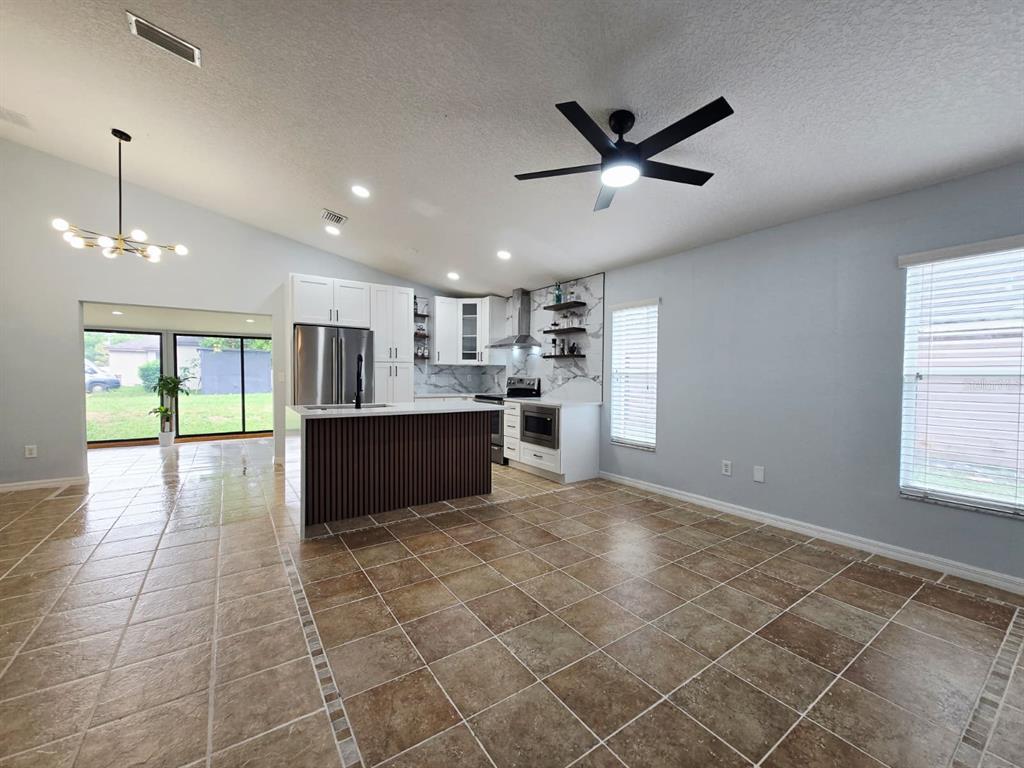 Cathedral Ceiling(s), Ceiling Fan(s), Dry Bar, Eating Space In Kitchen, Living Room/Dining Room Combo, Solid Surface Counters, Solid Wood Cabinets, Stone Counters, Thermostat, Walk-In Closet(s), Window Treatments
