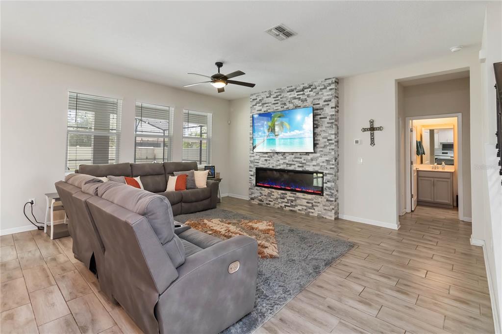 Ceiling Fan(s), Eating Space In Kitchen, High Ceilings, Kitchen/Family Room Combo, Living Room/Dining Room Combo, Open Floorplan, PrimaryBedroom Upstairs, Solid Wood Cabinets, Split Bedroom, Stone Counters, Thermostat, Walk-In Closet(s), Window Treatments