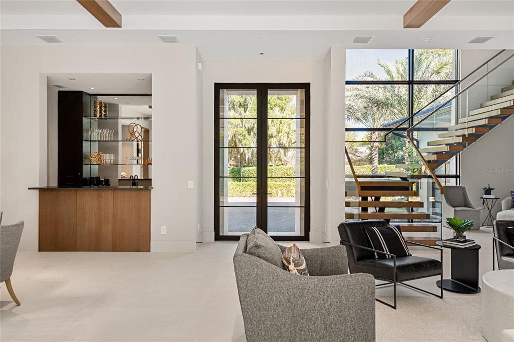 Built-in Features, Crown Molding, Dry Bar, Eating Space In Kitchen, High Ceilings, In Wall Pest System, Kitchen/Family Room Combo, Living Room/Dining Room Combo, Open Floorplan, Primary Bedroom Main Floor, Solid Wood Cabinets, Split Bedroom, Stone Counters, Thermostat, Walk-In Closet(s)