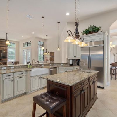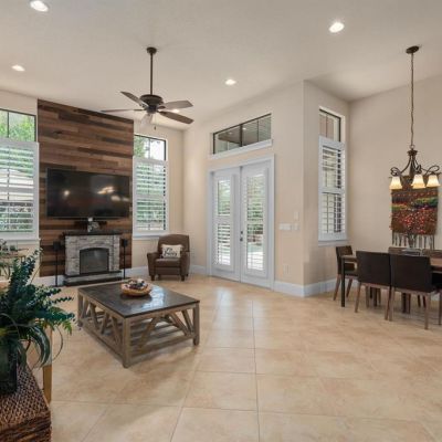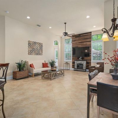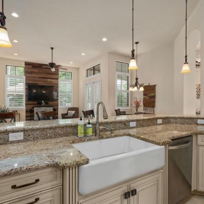 Cathedral Ceiling(s), Ceiling Fan(s), Coffered Ceiling(s), Crown Molding, Eating Space In Kitchen, High Ceilings, Kitchen/Family Room Combo, L Dining, Living Room/Dining Room Combo, Primary Bedroom Main Floor, Solid Surface Counters, Stone Counters, Tray Ceiling(s), Vaulted Ceiling(s), Window Treatments