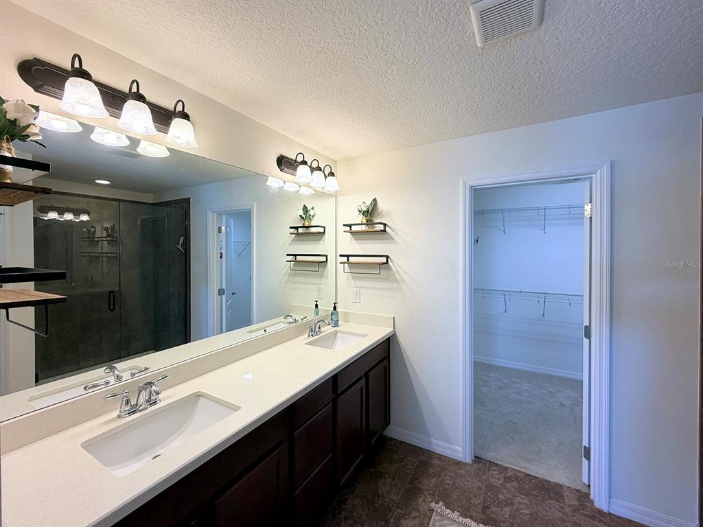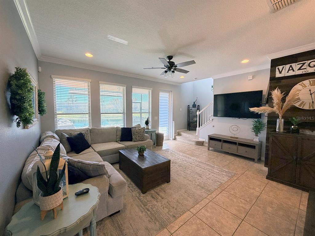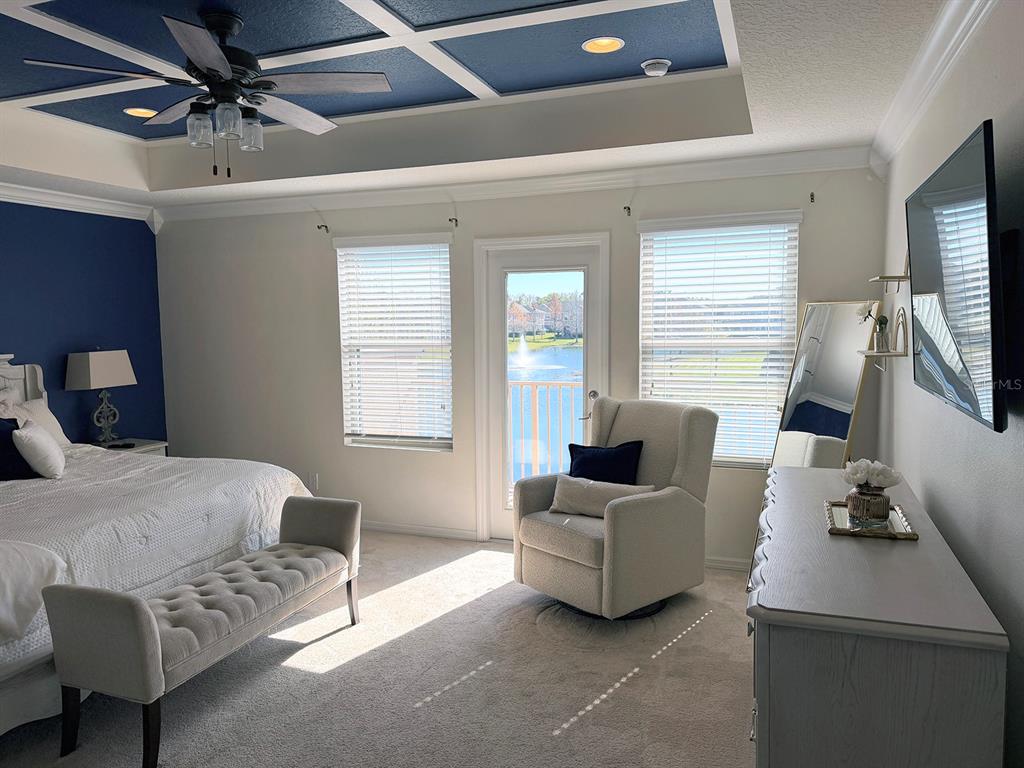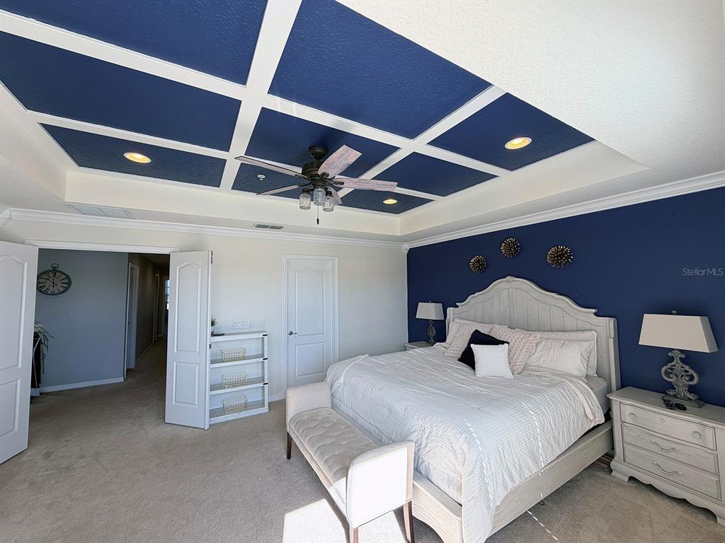 Ceiling Fan(s), Coffered Ceiling(s), Crown Molding, High Ceilings, Living Room/Dining Room Combo, PrimaryBedroom Upstairs, Stone Counters, Thermostat, Walk-In Closet(s)