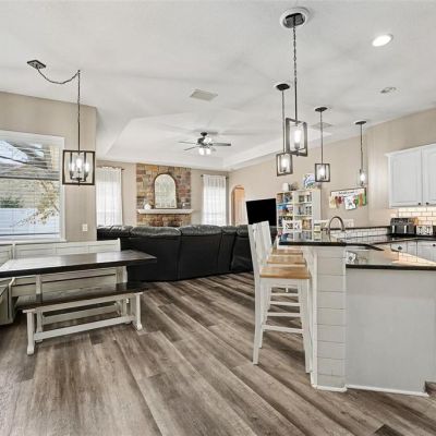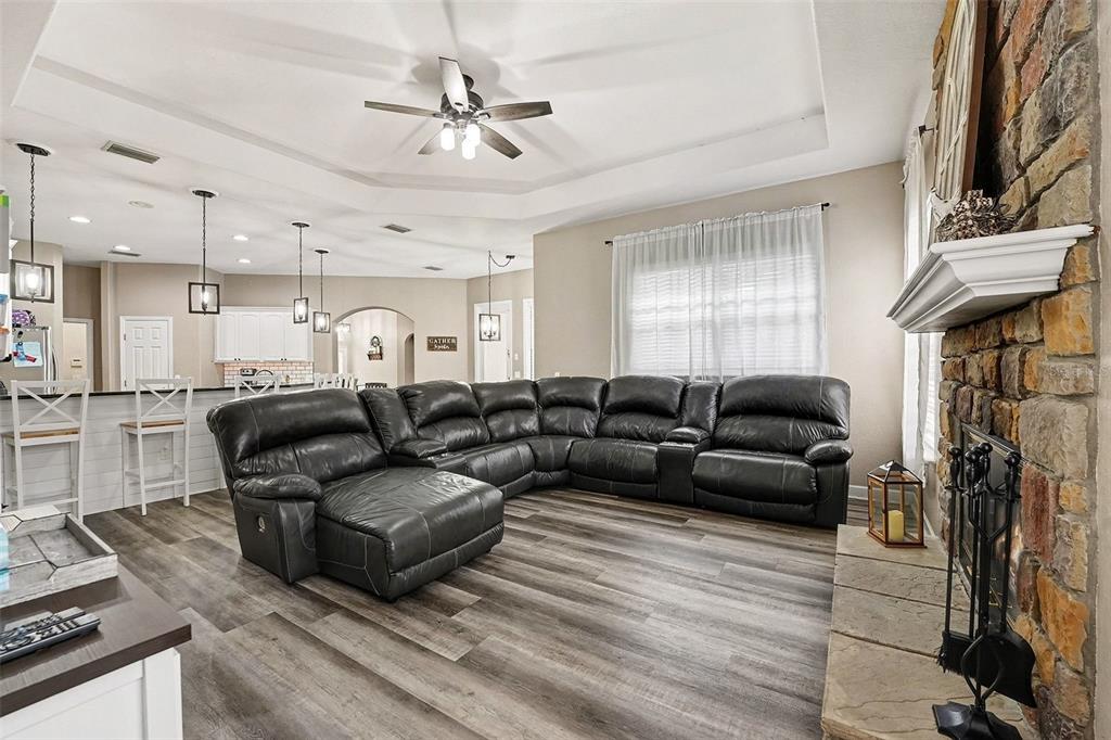 Ceiling Fan(s), Chair Rail, High Ceilings, Kitchen/Family Room Combo, Living Room/Dining Room Combo, Split Bedroom, Stone Counters, Thermostat, Tray Ceiling(s)