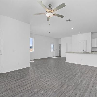 Attic Fan, Ceiling Fan(s), High Ceilings, Kitchen/Family Room Combo, Open Floorplan, Pest Guard System, PrimaryBedroom Upstairs, Solid Wood Cabinets, Stone Counters, Thermostat, Walk-In Closet(s), Window Treatments