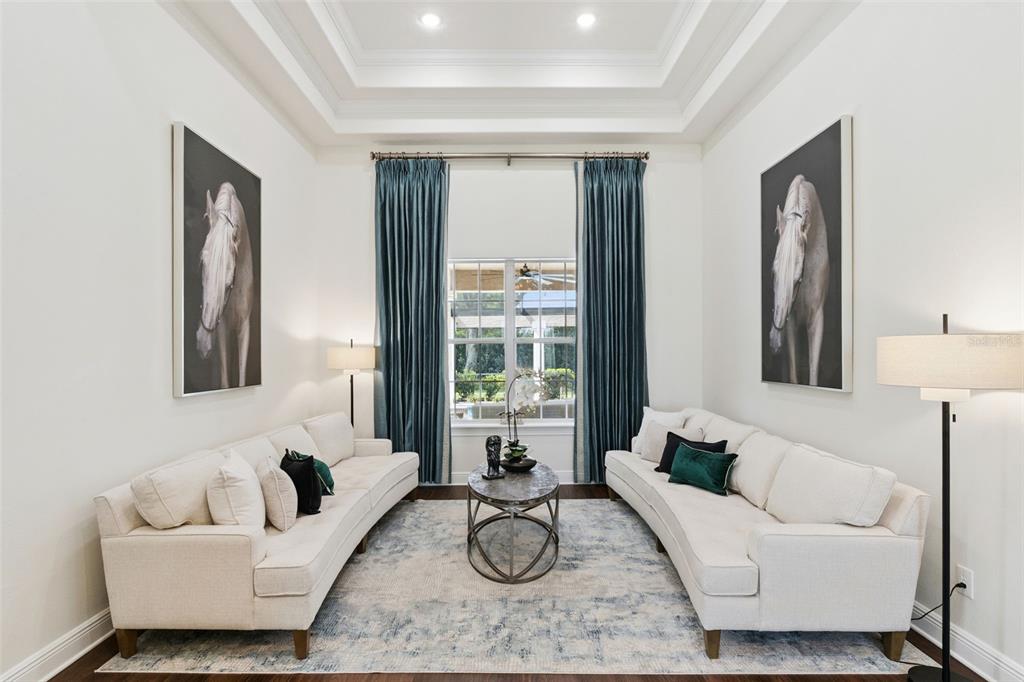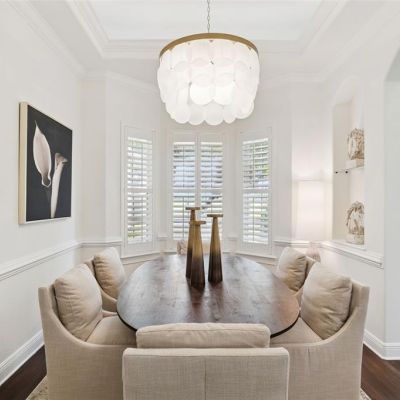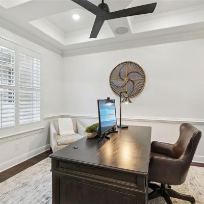 Built-in Features, Ceiling Fan(s), Crown Molding, Eating Space In Kitchen, High Ceilings, Kitchen/Family Room Combo, Primary Bedroom Main Floor, Solid Surface Counters, Solid Wood Cabinets, Split Bedroom, Thermostat, Tray Ceiling(s), Walk-In Closet(s), Window Treatments