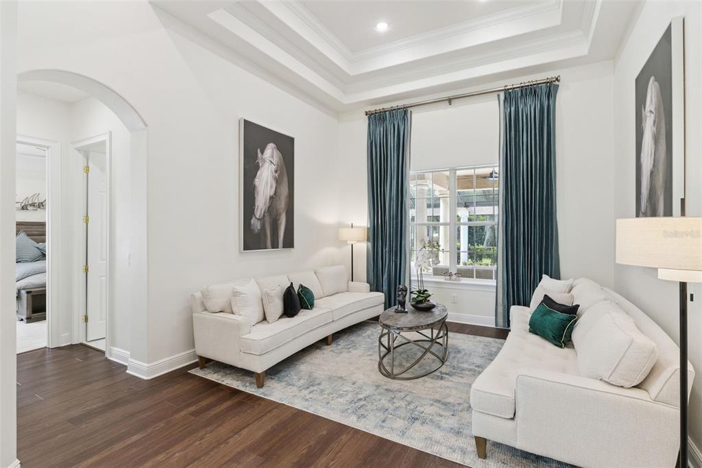 Built-in Features, Ceiling Fan(s), Crown Molding, Eating Space In Kitchen, High Ceilings, Kitchen/Family Room Combo, Primary Bedroom Main Floor, Solid Surface Counters, Solid Wood Cabinets, Split Bedroom, Thermostat, Tray Ceiling(s), Walk-In Closet(s), Window Treatments