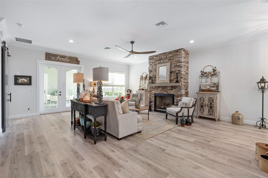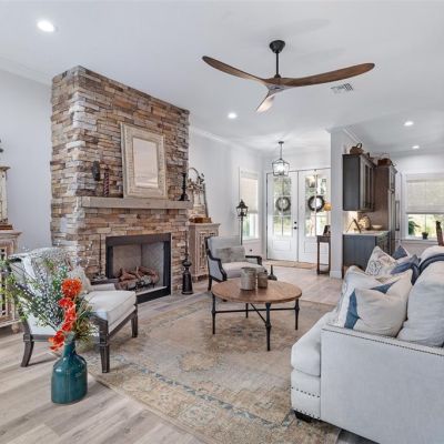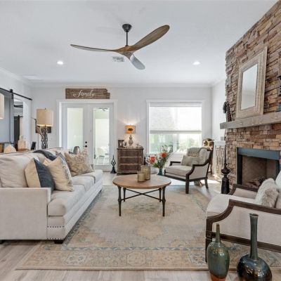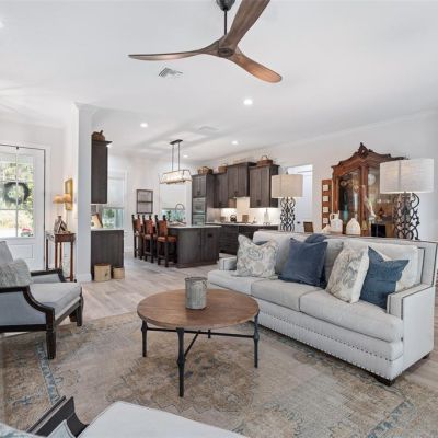 Ceiling Fan(s), Crown Molding, Eating Space In Kitchen, High Ceilings, Kitchen/Family Room Combo, Living Room/Dining Room Combo, Open Floorplan, Primary Bedroom Main Floor, Solid Surface Counters, Solid Wood Cabinets, Thermostat, Walk-In Closet(s), Window Treatments