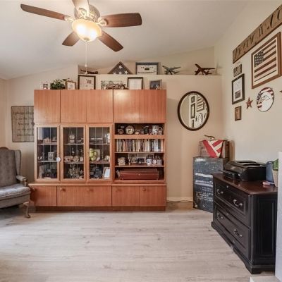 Built-in Features, Ceiling Fan(s), Coffered Ceiling(s), Eating Space In Kitchen, High Ceilings, L Dining, Split Bedroom, Stone Counters, Thermostat, Vaulted Ceiling(s), Walk-In Closet(s), Window Treatments