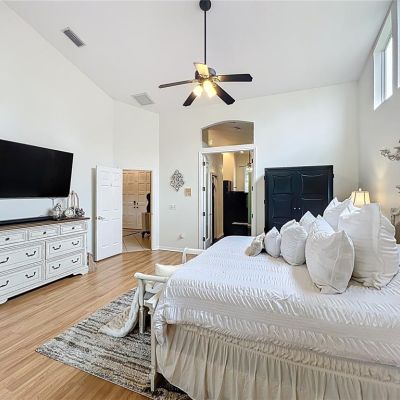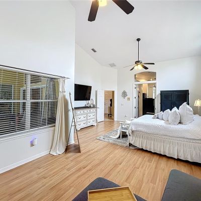 Ceiling Fan(s), Central Vacuum, Eating Space In Kitchen, High Ceilings, Kitchen/Family Room Combo, Living Room/Dining Room Combo, Open Floorplan, Primary Bedroom Main Floor, Solid Surface Counters, Solid Wood Cabinets, Split Bedroom, Stone Counters, Thermostat, Vaulted Ceiling(s), Walk-In Closet(s)