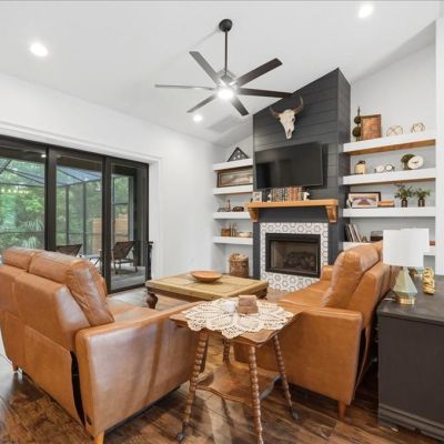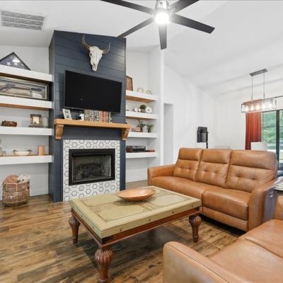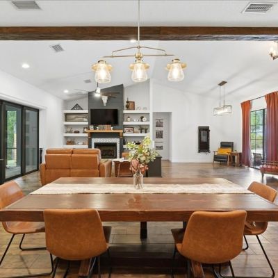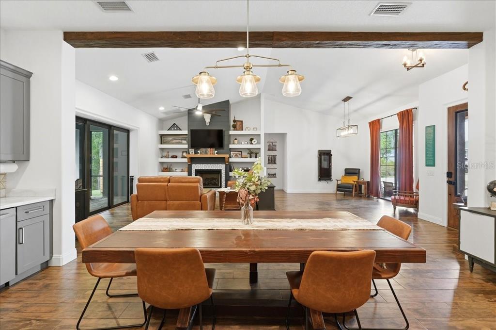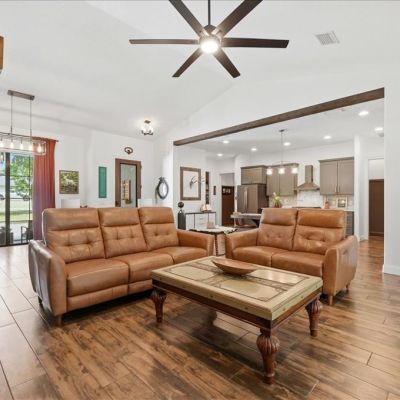 Built-in Features, Ceiling Fan(s), Eating Space In Kitchen, High Ceilings, Kitchen/Family Room Combo, Open Floorplan, Primary Bedroom Main Floor, Solid Wood Cabinets, Split Bedroom, Stone Counters, Thermostat, Vaulted Ceiling(s), Walk-In Closet(s), Window Treatments