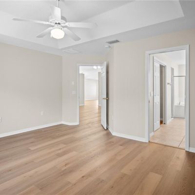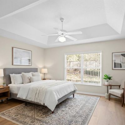 Ceiling Fan(s), Eating Space In Kitchen, Kitchen/Family Room Combo, Living Room/Dining Room Combo, Open Floorplan, Primary Bedroom Main Floor, Solid Surface Counters, Solid Wood Cabinets, Split Bedroom, Thermostat, Tray Ceiling(s), Vaulted Ceiling(s), Walk-In Closet(s), Window Treatments