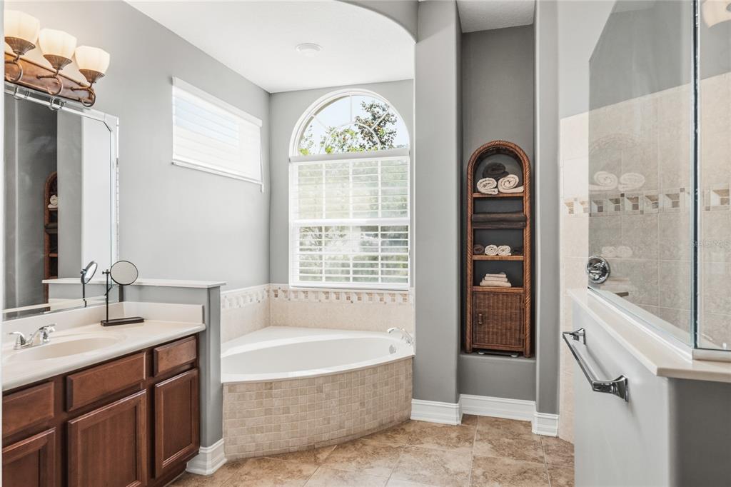 Built-in Features, Ceiling Fan(s), Coffered Ceiling(s), Eating Space In Kitchen, High Ceilings, Kitchen/Family Room Combo, Primary Bedroom Main Floor, Solid Surface Counters, Solid Wood Cabinets, Split Bedroom, Tray Ceiling(s), Walk-In Closet(s), Window Treatments