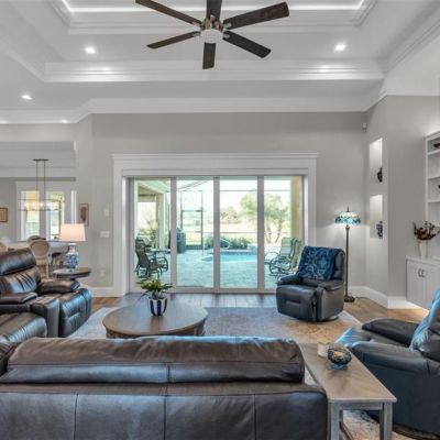 Built-in Features, Ceiling Fan(s), Crown Molding, Eating Space In Kitchen, High Ceilings, Open Floorplan, Split Bedroom, Stone Counters, Tray Ceiling(s), Walk-In Closet(s), Window Treatments