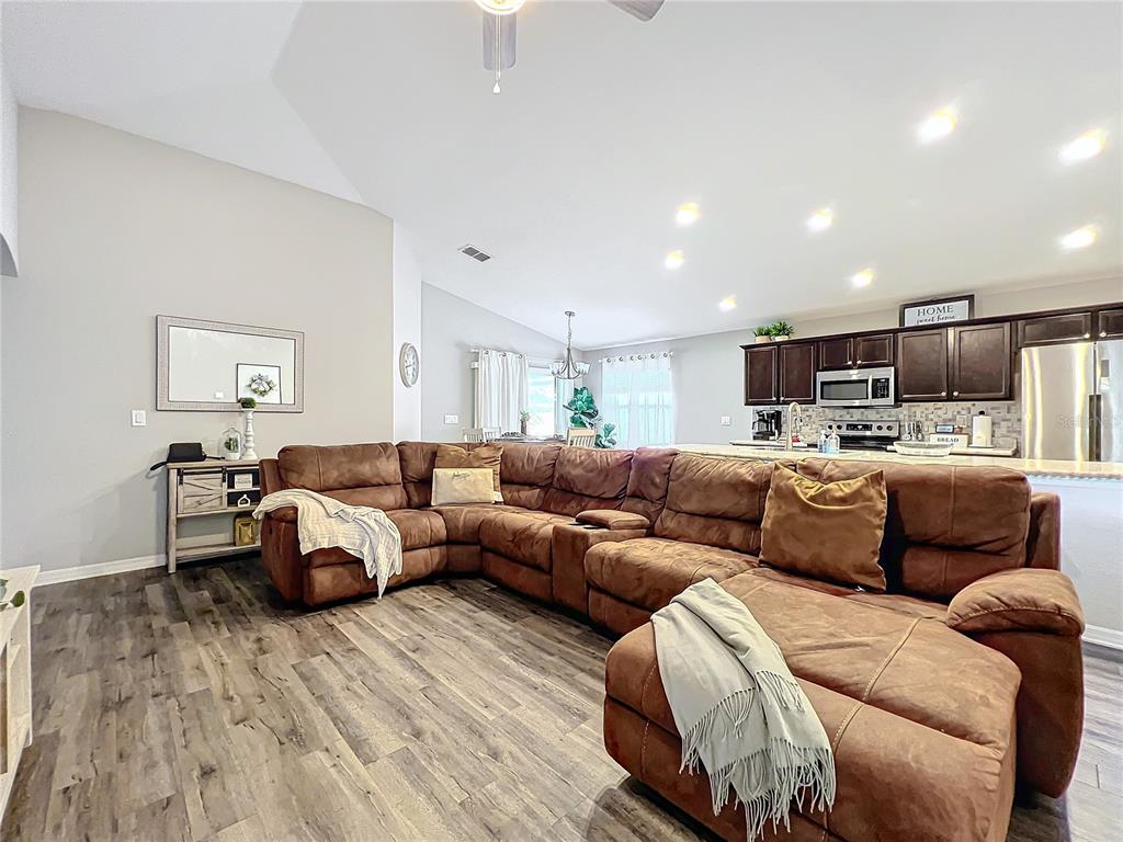 Cathedral Ceiling(s), Ceiling Fan(s), Crown Molding, High Ceilings, In Wall Pest System, Kitchen/Family Room Combo, Living Room/Dining Room Combo, Open Floorplan, Primary Bedroom Main Floor, Solid Wood Cabinets, Stone Counters, Thermostat, Tray Ceiling(s)