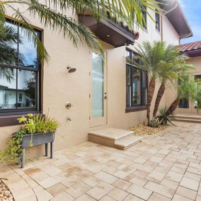 Balcony, French Doors, Irrigation System, Lighting, Outdoor Kitchen, Outdoor Shower, Rain Gutters, Sidewalk, Sliding Doors, Sprinkler Metered