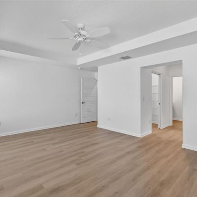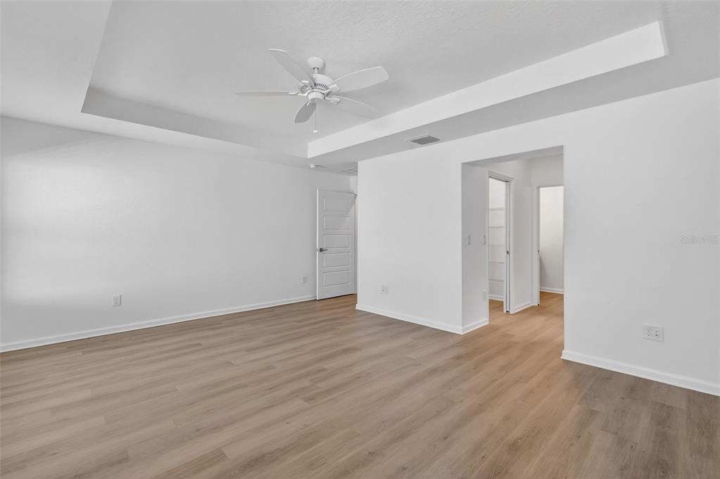 Ceiling Fan(s), Eating Space In Kitchen, High Ceilings, Living Room/Dining Room Combo, Open Floorplan, Primary Bedroom Main Floor, Solid Surface Counters, Split Bedroom, Thermostat, Tray Ceiling(s), Vaulted Ceiling(s), Walk-In Closet(s)