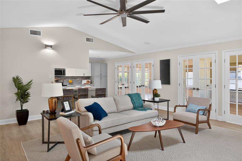 Ceiling Fan(s), Crown Molding, Kitchen/Family Room Combo, L Dining, Living Room/Dining Room Combo, Open Floorplan, Primary Bedroom Main Floor, Skylight(s)