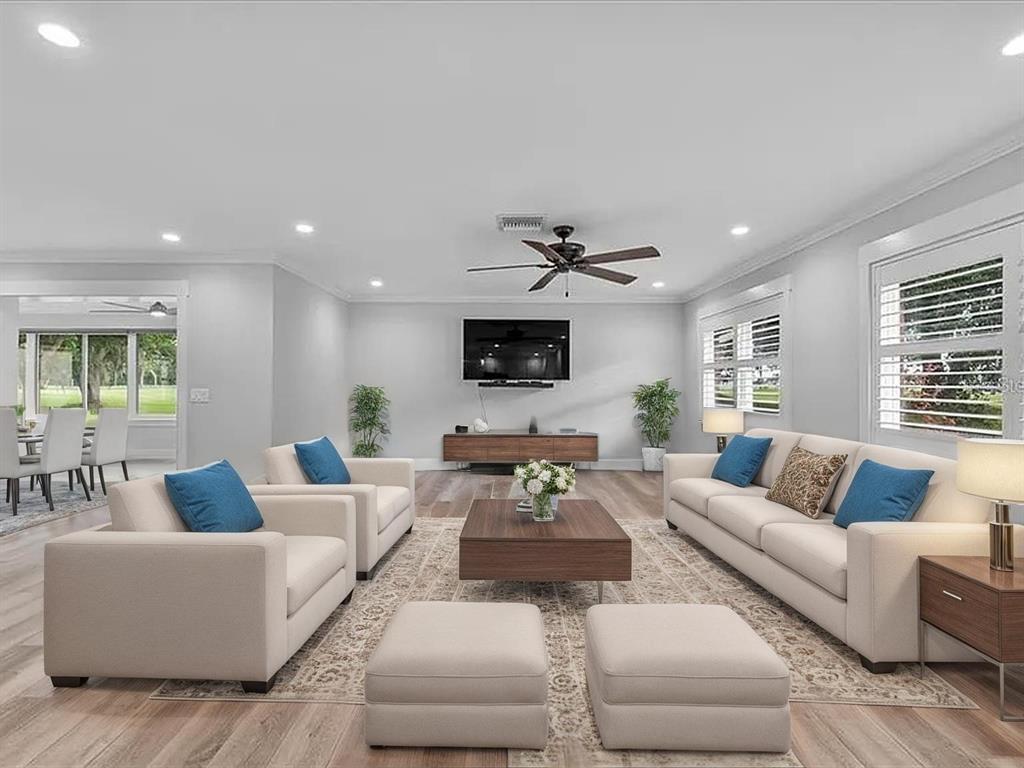 Built-in Features, Ceiling Fan(s), Crown Molding, Eating Space In Kitchen, Open Floorplan, Other, Solid Surface Counters, Solid Wood Cabinets, Split Bedroom, Stone Counters, Thermostat, Walk-In Closet(s), Window Treatments