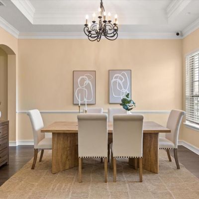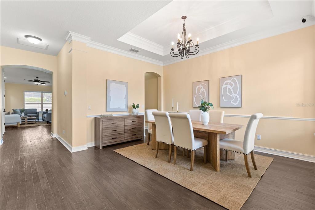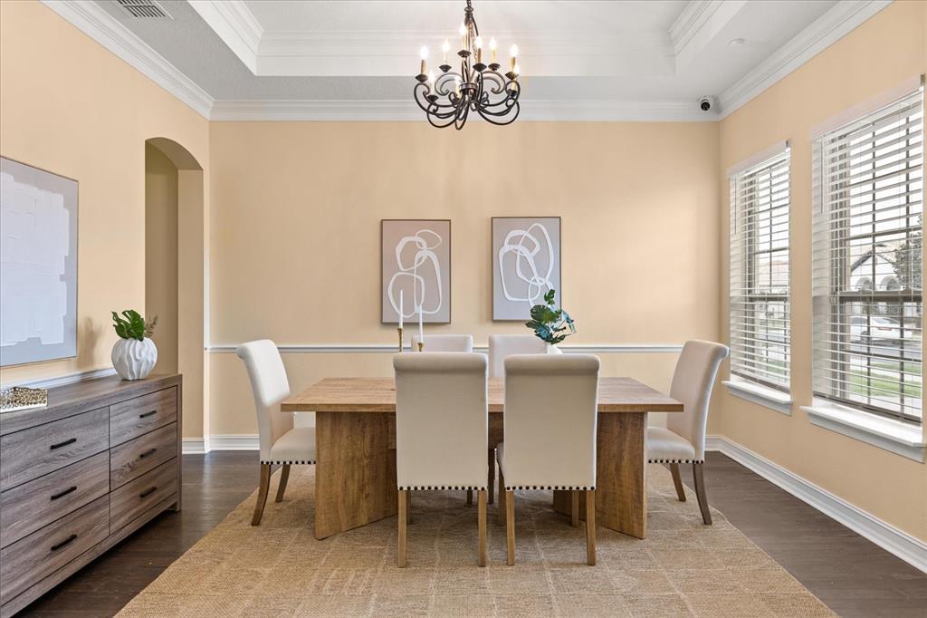 Built-in Features, Chair Rail, Crown Molding, Kitchen/Family Room Combo, Open Floorplan, Primary Bedroom Main Floor, Split Bedroom, Stone Counters, Thermostat, Tray Ceiling(s), Walk-In Closet(s), Window Treatments