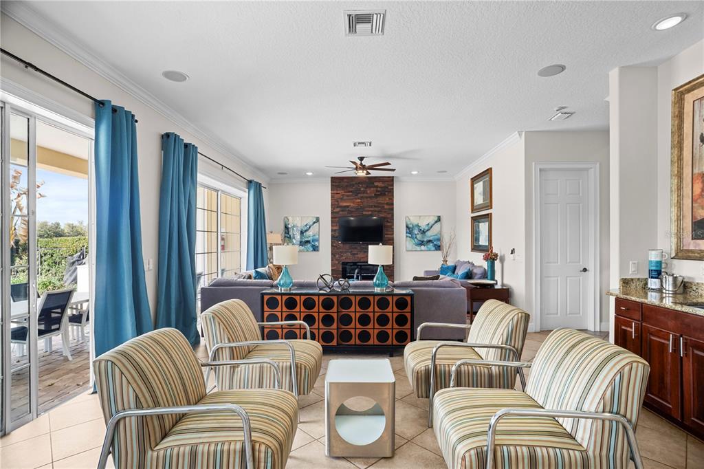 Built-in Features, Ceiling Fan(s), Coffered Ceiling(s), Crown Molding, High Ceilings, Kitchen/Family Room Combo, Open Floorplan, PrimaryBedroom Upstairs, Solid Wood Cabinets, Stone Counters, Thermostat, Tray Ceiling(s), Walk-In Closet(s), Wet Bar, Window Treatments