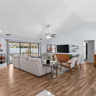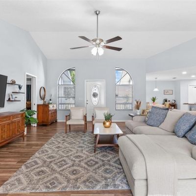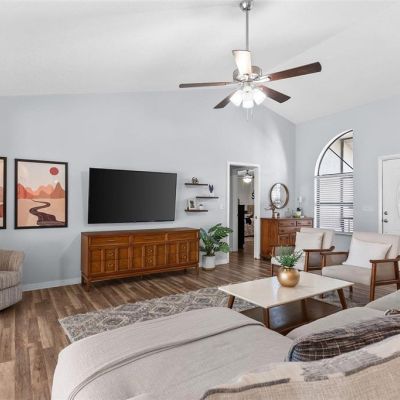 Ceiling Fan(s), Eating Space In Kitchen, High Ceilings, Kitchen/Family Room Combo, Open Floorplan, Primary Bedroom Main Floor, Solid Surface Counters, Vaulted Ceiling(s), Walk-In Closet(s)