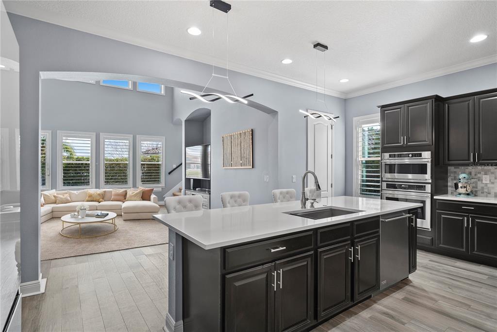 Ceiling Fan(s), Crown Molding, High Ceilings, Kitchen/Family Room Combo, Open Floorplan, Other, Primary Bedroom Main Floor, Solid Surface Counters, Solid Wood Cabinets, Split Bedroom, Stone Counters, Thermostat, Walk-In Closet(s)