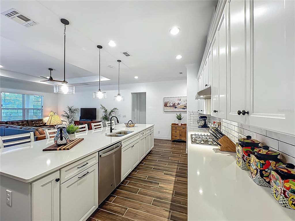 Ceiling Fan(s), Crown Molding, Eating Space In Kitchen, High Ceilings, Kitchen/Family Room Combo, Open Floorplan, Primary Bedroom Main Floor, Solid Wood Cabinets, Split Bedroom, Stone Counters, Thermostat, Tray Ceiling(s), Vaulted Ceiling(s), Walk-In Closet(s), Window Treatments