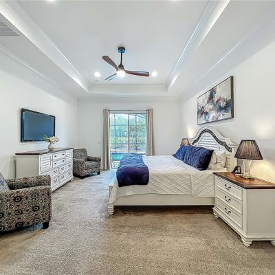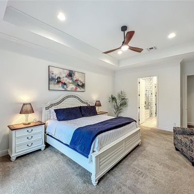 Ceiling Fan(s), Crown Molding, Eating Space In Kitchen, High Ceilings, Kitchen/Family Room Combo, Open Floorplan, Primary Bedroom Main Floor, Solid Wood Cabinets, Split Bedroom, Stone Counters, Thermostat, Tray Ceiling(s), Vaulted Ceiling(s), Walk-In Closet(s), Window Treatments