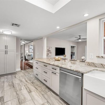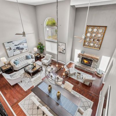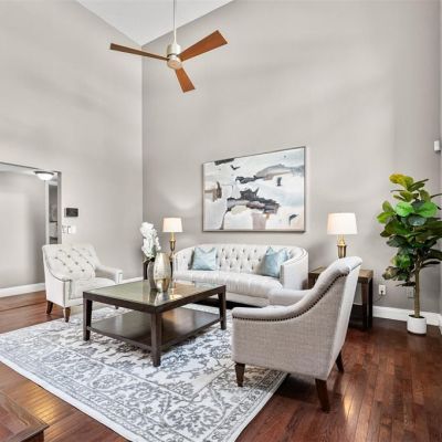 Ceiling Fan(s), Eating Space In Kitchen, High Ceilings, Kitchen/Family Room Combo, Living Room/Dining Room Combo, Open Floorplan, Primary Bedroom Main Floor, Skylight(s), Solid Surface Counters, Split Bedroom, Stone Counters, Thermostat, Walk-In Closet(s), Window Treatments