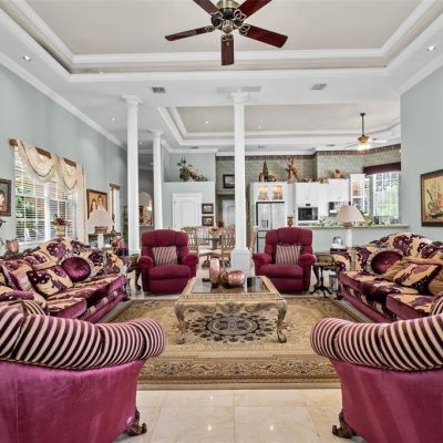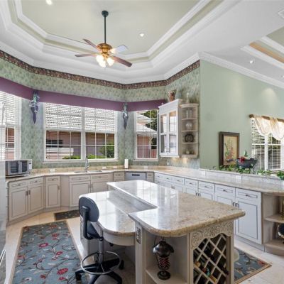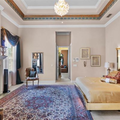 Built-in Features, Cathedral Ceiling(s), Ceiling Fan(s), Chair Rail, Coffered Ceiling(s), Crown Molding, Eating Space In Kitchen, High Ceilings, Kitchen/Family Room Combo, Living Room/Dining Room Combo, Open Floorplan, Primary Bedroom Main Floor, Split Bedroom, Stone Counters, Thermostat, Walk-In Closet(s), Window Treatments