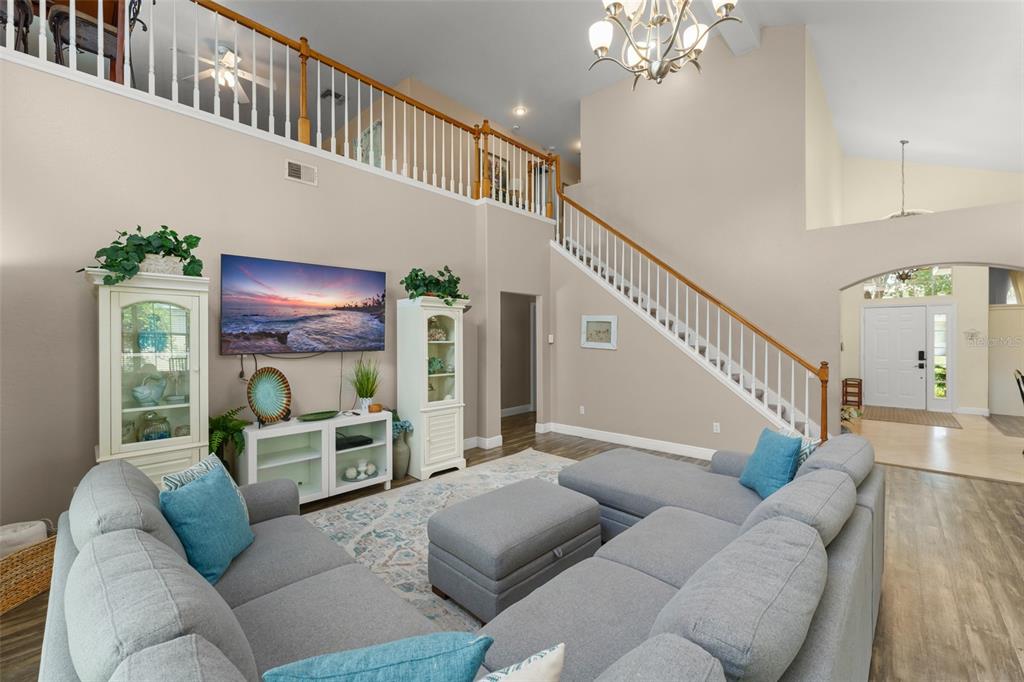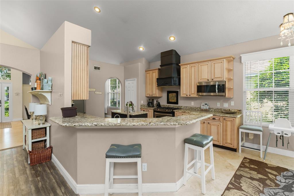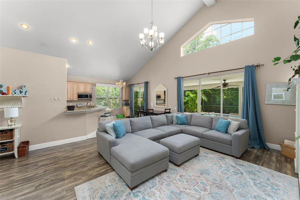 Built-in Features, Cathedral Ceiling(s), Ceiling Fan(s), Kitchen/Family Room Combo, Living Room/Dining Room Combo, Open Floorplan, Primary Bedroom Main Floor, Solid Surface Counters, Solid Wood Cabinets, Stone Counters