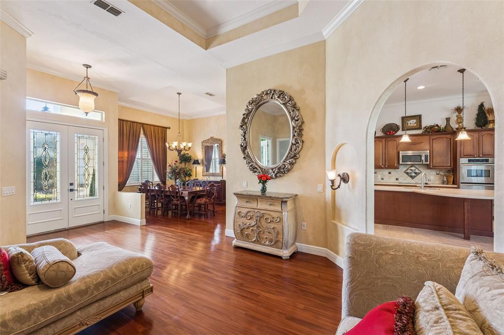 Ceiling Fan(s), Crown Molding, High Ceilings, Kitchen/Family Room Combo, Primary Bedroom Main Floor, Walk-In Closet(s)