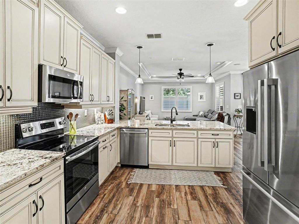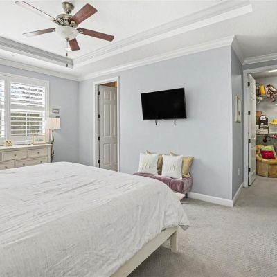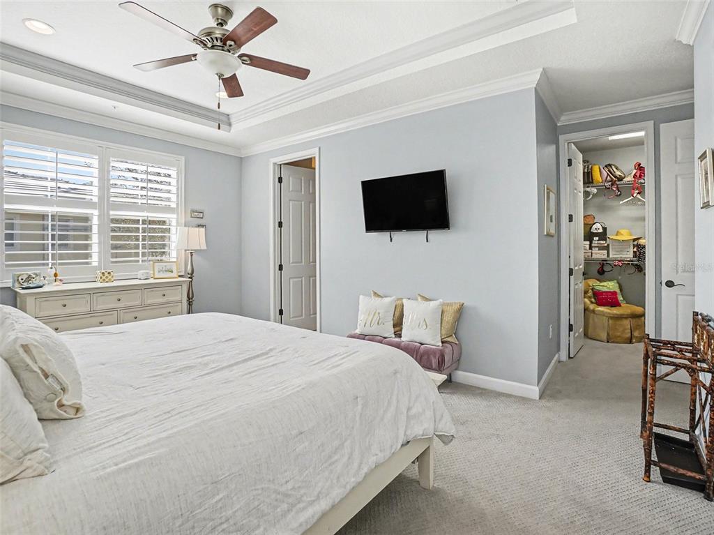 Ceiling Fan(s), Coffered Ceiling(s), Crown Molding, Eating Space In Kitchen, High Ceilings, Kitchen/Family Room Combo, Open Floorplan, PrimaryBedroom Upstairs, Stone Counters, Thermostat, Walk-In Closet(s), Window Treatments