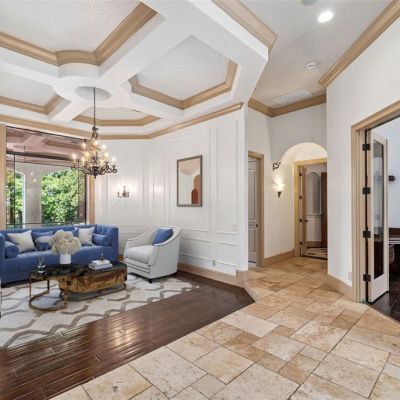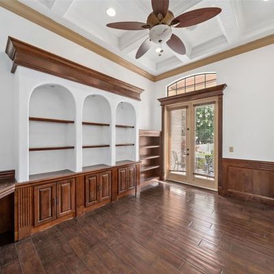 Built-in Features, Ceiling Fan(s), Coffered Ceiling(s), Crown Molding, Eating Space In Kitchen, High Ceilings, Kitchen/Family Room Combo, Primary Bedroom Main Floor, Sauna, Solid Wood Cabinets, Stone Counters, Thermostat, Walk-In Closet(s), Wet Bar