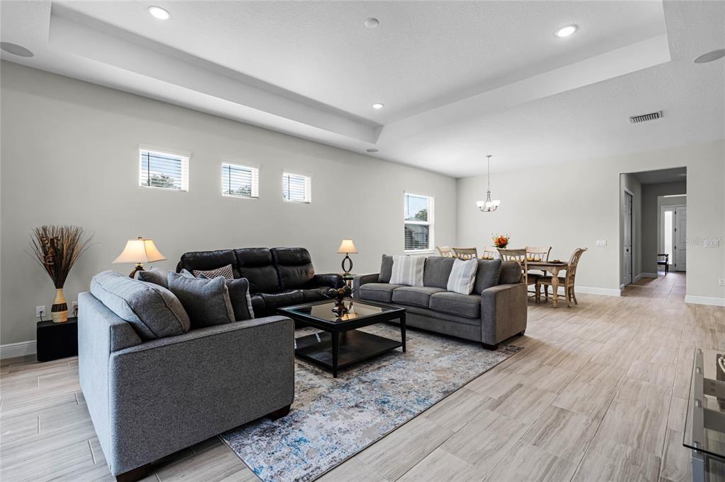 Ceiling Fan(s), Eating Space In Kitchen, High Ceilings, In Wall Pest System, Living Room/Dining Room Combo, Open Floorplan, Primary Bedroom Main Floor, Solid Surface Counters, Solid Wood Cabinets, Split Bedroom, Stone Counters, Thermostat, Tray Ceiling(s), Walk-In Closet(s), Window Treatments
