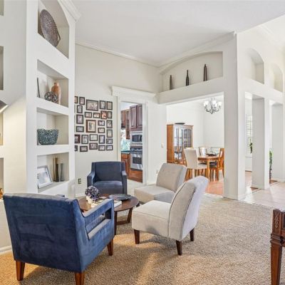 Ceiling Fan(s), Crown Molding, Kitchen/Family Room Combo, L Dining, Living Room/Dining Room Combo, Primary Bedroom Main Floor, Solid Wood Cabinets, Split Bedroom, Thermostat, Walk-In Closet(s)
