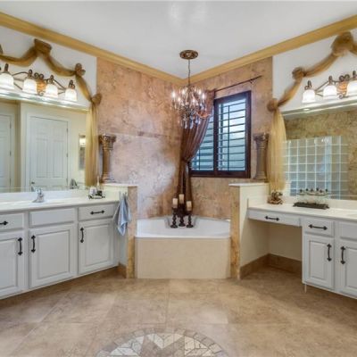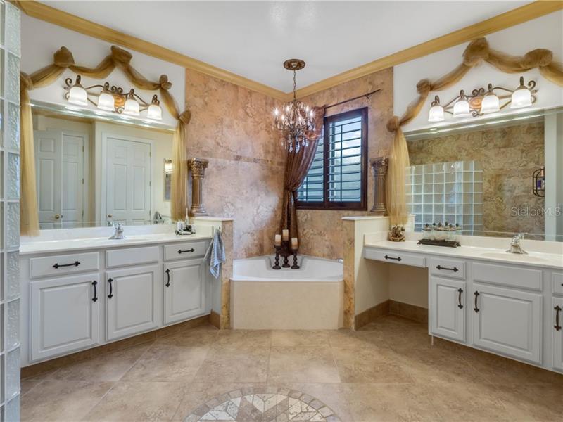 • His & Hers Vanities Wrapped in Marble Flank the Tub