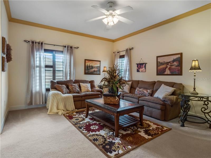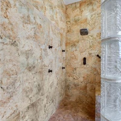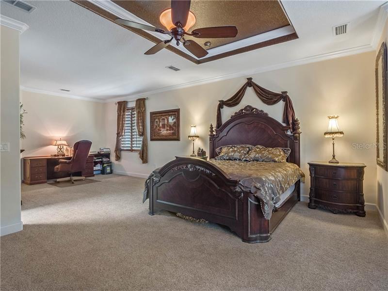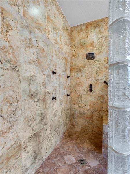 The moment you enter the large double doors you will be impressed with the 22’ ceiling foyer with Travertine porcelain floors and custom Redwood staircase. To your left are stone arches that open to the dining room and living room with 15’ ceilings. The family room also has 22’ ceilings and a stone fireplace with an inset for the television center accompanied by a wine cellar alcove. This home has 10 ‘ ceilings throughout with crown molding in every room. All wet areas are tiled with tile baseboards.