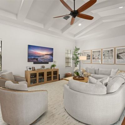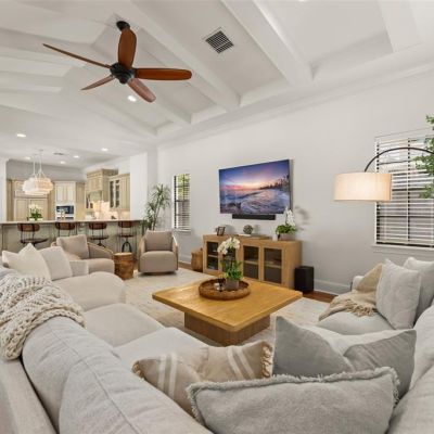 Built-in Features, Ceiling Fan(s), Eating Space In Kitchen, High Ceilings, Kitchen/Family Room Combo, Open Floorplan, Primary Bedroom Main Floor, Solid Wood Cabinets, Split Bedroom, Stone Counters, Thermostat, Walk-In Closet(s), Window Treatments
