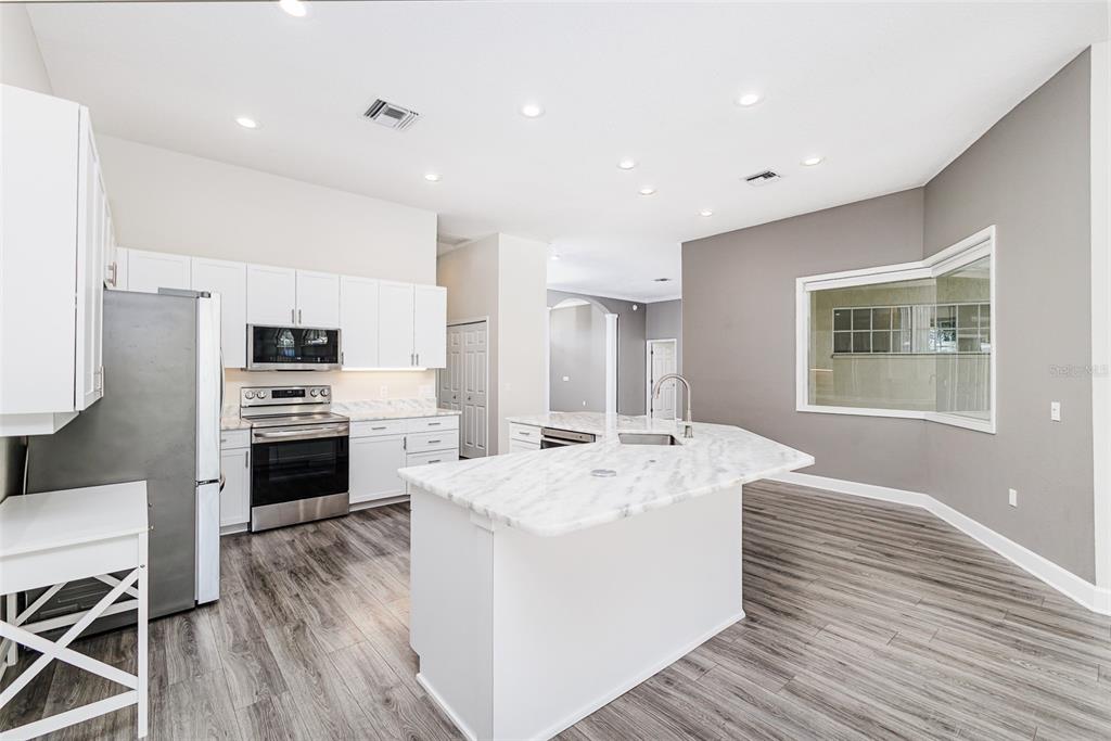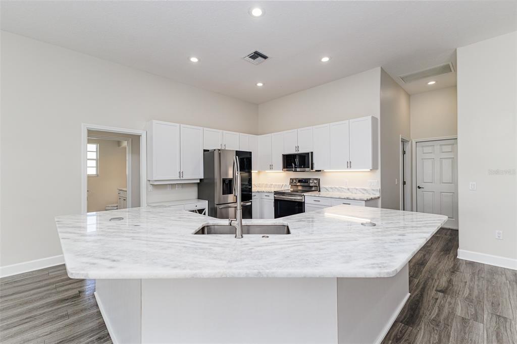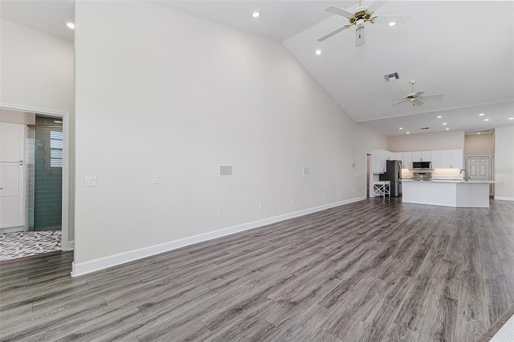 Ceiling Fan(s), High Ceilings, Kitchen/Family Room Combo, L Dining, Open Floorplan, Split Bedroom, Stone Counters, Tray Ceiling(s), Walk-In Closet(s)