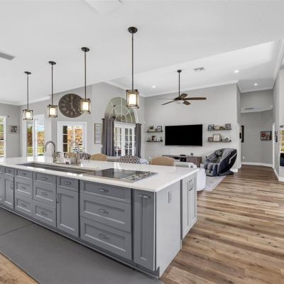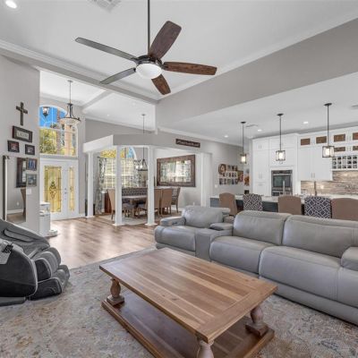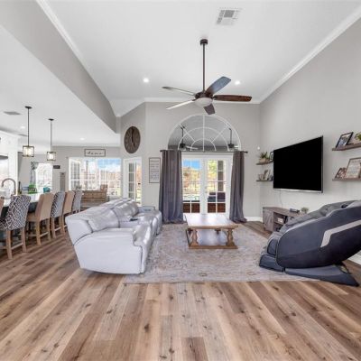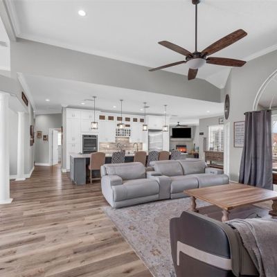 Ceiling Fan(s), Crown Molding, Eating Space In Kitchen, High Ceilings, Kitchen/Family Room Combo, Open Floorplan, Primary Bedroom Main Floor, Solid Surface Counters, Solid Wood Cabinets, Split Bedroom, Stone Counters, Vaulted Ceiling(s), Walk-In Closet(s), Window Treatments
