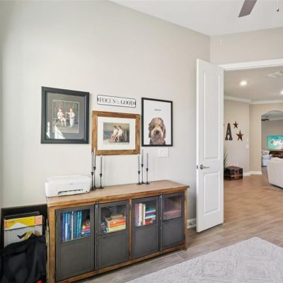 Ceiling Fan(s), Crown Molding, Eating Space In Kitchen, High Ceilings, Kitchen/Family Room Combo, Living Room/Dining Room Combo, Open Floorplan, Primary Bedroom Main Floor, Solid Wood Cabinets, Stone Counters, Thermostat, Walk-In Closet(s), Window Treatments