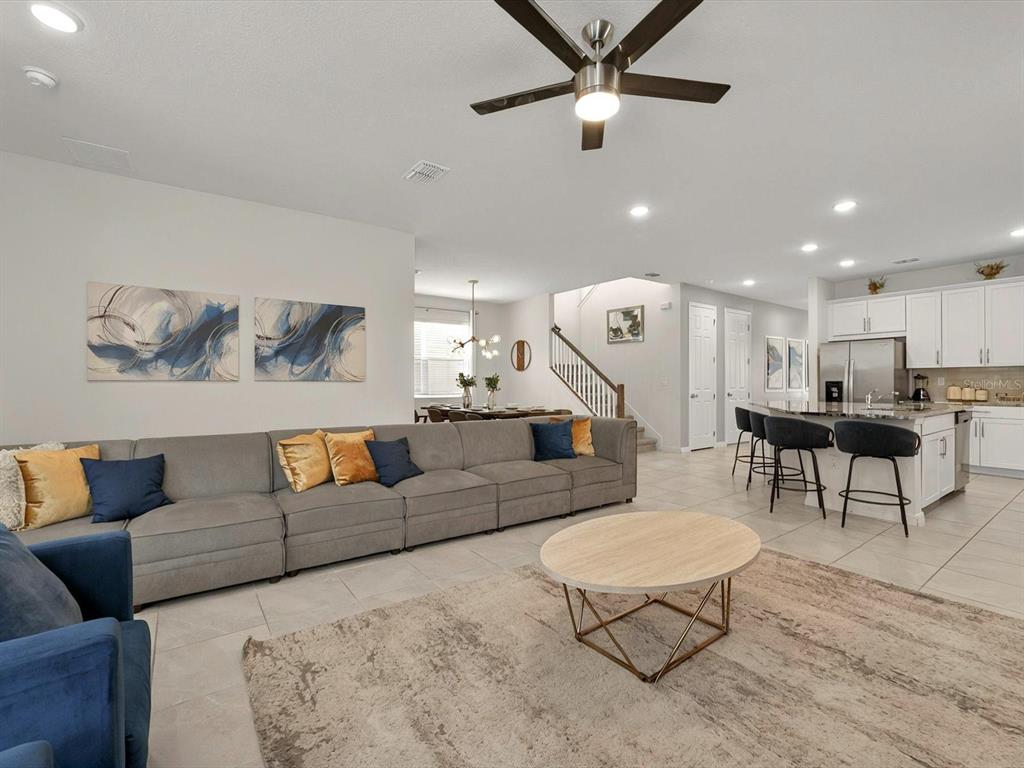 Ceiling Fan(s), Eating Space In Kitchen, High Ceilings, Kitchen/Family Room Combo, Open Floorplan, Primary Bedroom Main Floor, PrimaryBedroom Upstairs, Solid Surface Counters, Thermostat, Walk-In Closet(s), Window Treatments