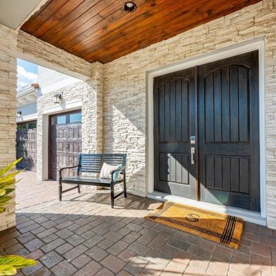 Balcony, Lighting, Outdoor Grill, Outdoor Kitchen, Rain Gutters, Shade Shutter(s), Sidewalk, Sliding Doors