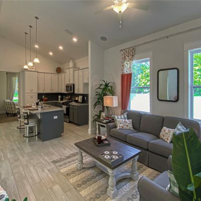 Ceiling Fan(s), High Ceilings, Kitchen/Family Room Combo, Open Floorplan, Pest Guard System, Primary Bedroom Main Floor, Solid Surface Counters, Split Bedroom, Thermostat, Vaulted Ceiling(s), Walk-In Closet(s), Window Treatments
